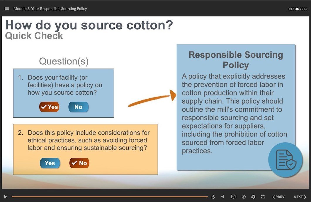 In April 2025, YESS launched our first e-learning course for spinning and fabric mills. The learning platform is designed to scale our training capacity while strengthening mills’ understanding of responsible sourcing.